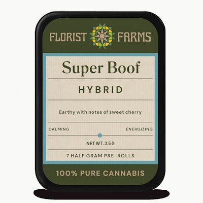 Super Boof earned Leafly's 2024 Strain of the Year by crossing Black Cherry Punch with Tropicana Cookies. Originally bred by California's Blockhead as "Blockberry," this balanced hybrid delivers earthy undertones layered with sweet cherry and bright citrus notes. Dominant myrcene drives deep relaxation while limonene adds an uplifting spark. Effects bring euphoria, creativity, and focused energy that gently mellows into calm. Perfect for creative afternoons. Light up some award-winning flower! Florist Farms is an organic farm that practices regenerative farming practices based in Cortland, New York. It’s Florist Farms' commitment to making the finest, carefully crafted products free of pesticides, chemicals, and fillers. All from right here in New York. Florist Farms is all about letting cannabis be cannabis—pure, simple, and unaltered. Their commitment to sustainability and transparency sets them apart, making their products a favorite for people who love weed.