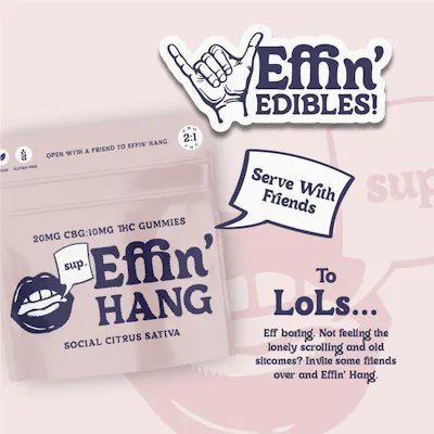 Effin’ Hang is your go-to gummy for good vibes and great company, with 20mg of CBG and 10mg of THC in every piece (100mg per package). CBG, often dubbed the “social cannabinoid,” works together with THC to create an uplifting, energizing effect perfect for socializing and mingling. Whether you’re gearing up for a night out or just want to elevate your mood, Effin’ Hang gives you that perfect boost to rise against boring and get to schmoozing, all with a delicious flavor to match.