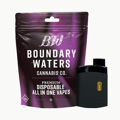 Boundary Waters disposable all-in-one vapes are convenient, single-use devices that are pre-charged and pre-filled with a blend of premium-quality distillates and terpenes. Boundary Waters vape pens come in Indica, Sativa, & Hybrid varieties to deliver a tailored experience. The primary active ingredient in this product is delta-9-tetrahydrocannabinol (THC). -- Contains: Cannabis Oil Distillate and Sour Patch Watermelon Terpenes (d-Limonene, ß-Myrcene, ß-Caryophyllene) -- Indica -- THC: 900 mg/cartridge CBD: <5%