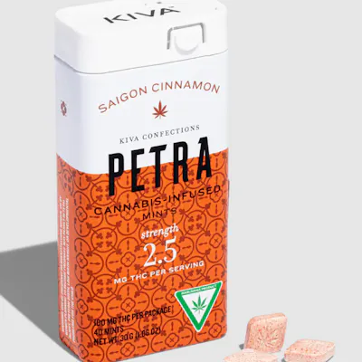 Sweet and spicy with just a touch of heat, Saigon Cinnamon Petra freshens your breath and warms your senses. Highly portable, decidedly poppable, and subtly powerful, this low-dose, sugar-free and vegan mint is subtly dosed for an optimal cannabis experience every time. Whether spicy, sweet, savory or strong, Petra has a flavor that everyone can savor. Since 2010, Kiva’s goal has been to create an edible that redefines what a cannabis confection can be. From our artisanal approach to making chocolates to our inventive take on gummies, we’ve dedicated ourselves to crafting delicious, trustworthy, and premium edibles you can feel good about eating. Made in a facility that processes milk, nuts, soy and gluten.