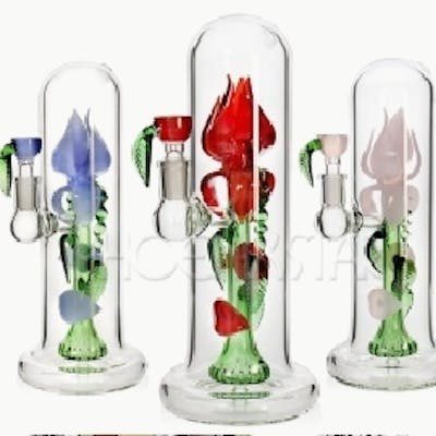 This 9" water pipe blends elegance with performance. Featuring a beautifully crafted glass rose centerpiece, it adds a touch of artistry to your session while serving as a standout visual detail. The built-in percolators deliver smooth, filtered hits by diffusing smoke through water for cleaner, cooler pulls. Compact yet striking, this piece is made from thick, high-quality glass for durability and style. Perfect for anyone who wants function, filtration, and a unique design in one.