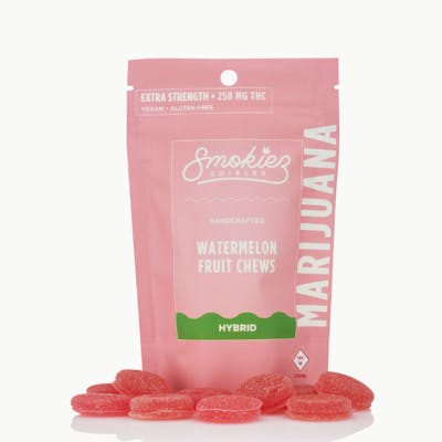 Smokiez Sour Watermelon Fruit Chews are NOT YOUR AVERAGE GUMMY™ These delicious Fruit Chews are a tasty and satisfying way for your customers to medicate! They are also Vegan, Gluten-Free, Dairy-Free, and contain NO High Fructose Corn Syrup. Each of our mouth-watering Fruit Chews contains 25 mg of THC, and are made with our high clarity cannabis distillate for great taste. There are 10 pieces per package with 250 mg active THC per package.