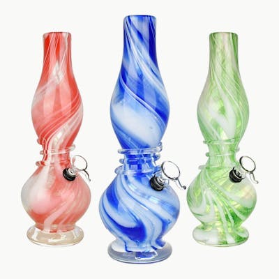 Developing Dreams Soft Glass Water Pipes are crafted with malleable soft glass into elegant shapes with vivid coloring. The pipes have an hourglass vase shape with a twisted color design and a decorative glass coil around the neck. These water pipes stand 12.25 inches (31.1cm) tall, and each pipe includes a grommet style herb slide connection and downstem. Colors vary.