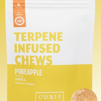 10 pieces, 25 mg per piece. 250 mg per unit. Meet our Terpene Chews, the pioneer in terpene-infused formulations for precise and tailored effects. Standing as the exclusive Chew with terpene levels significant enough to be reported on test results, it guarantees unmatched quality. Indulge in the mouthwatering pineapple flavor of these Indica Chews, meticulously formulated with Myrcene and Linalool. These terpenes work synergistically to deliver calming and stress-relieving effects, making them ideal for nighttime use. Choose between the available 5mg and 25mg dosing options to find the potency that suits your needs. Experience the epitome of cannabis refinement with this groundbreaking Chew, revolutionizing your nighttime routine.