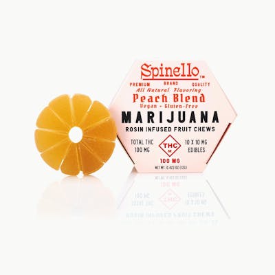 Spinello Peach Hybrid Rosin Fruit Chews 100 mg THC per package, 10 mg per serving. Easy Dosing with a scored 10 serving Fruit Chew. From the Creators of Smokiez Edibles!
