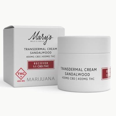 400mg THC 400mg CBD 2oz Experience soothing relief with our Recover Transdermal Cream. Specially formulated, this cream offers a relaxing sandalwood scent and cannabinoids that offer targeted support for restoration. Recover Cream allows you to harness the power of nature to help your body bounce back.