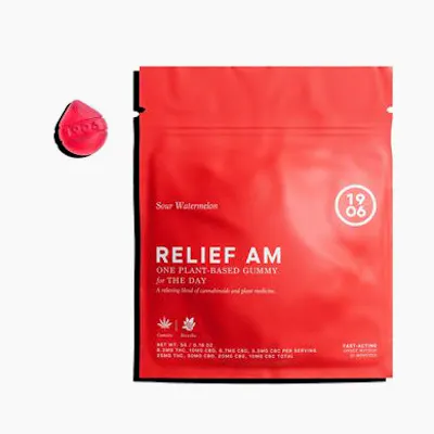 1906 Relief AM (Sour Watemelon): The first and only fast-acting precision gummy designed to target daytime pain. A blend of 4 cannabinoids and Boswellia extract relieves psychological and physiological pains, reduces inflammation, and improves overall quality of life. Each Relief AM gummy contains 25mg THC, 30mg CBD, 20mg CBG, 10mg CBC, and 40mg Boswellia Extract.