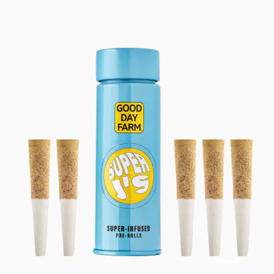 Good Day Farm Super J's packs are filled with five 0.5g pre-rolls that are super-infused for superior power and superior flavor. We start with Good Day Farm premium, full flower and super-infuse it with an explosion of flavorful terpenes and potent cannabis oil. We take that THC-loaded flower, roll it with organic papers, and coat it with a supersuit of premium kief. With five infused pre-rolls to a pack, you can fly a little higher (and keep going back for more)! Strain-Specific | Super-Infused | Ready to Spark Super People. Super Cannabis. Super J's.