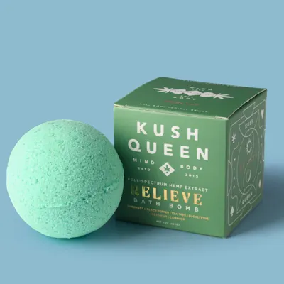 KUSH QUEEN RELIEVE BATH BOMBS: Soak into scientific self-care: get your skin “high” with a topical blend of cannabinoids and essential oils targeted for soothing aching muscles. Kush Queen Relieve Bath Bombs provide powerful mind-body relief, muscle relaxation, color therapy, aromatherapy, and ASMR. HOW DO WE DO IT? Relieve Bath Bombs are intelligently designed with a blend of nine essential oils (including rosemary, tea tree, and eucalyptus essential oils) and cannabinoids to provide effective, proven relief for sore muscles, achy joints, and body tension. TLDR; We’re so much more than those $5 artificial-fragrance-filled bath bombs. We’re rooted in science. Cannabinoids provide topical relief for sore muscles and achy bones by interacting with your body’s cannabinoid receptors. These receptors help regulate inflammation, pain, and stress levels. Blend of 9 essential oils provide targeted aromatherapy for mental clarity and are proven to relieve stress while leaving your skin so soft.