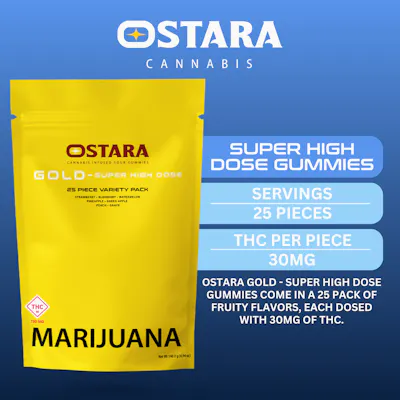 Ostara Gold - Super High Dose Gummies come in a 25 pack of fruity flavors, each dosed with 30mg of THC.