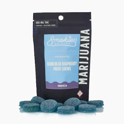 Smokiez Terpene-Enhanced Indica Sour Blue Raspberry Fruit Chews are NOT YOUR AVERAGE GUMMY™ These delicious Fruit Chews are a tasty and satisfying way for your customers to medicate! They are also Vegan, Gluten-Free, Dairy-Free, and contain NO High Fructose Corn Syrup. Each of our mouth-watering Fruit Chews contains 10 mg of THC, and are made with our high clarity cannabis distillate for great taste. There are 10 pieces per package with 100 mg active THC per package.