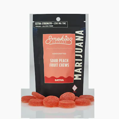 Smokiez SATIVA Sour Peach Fruit Chews are NOT YOUR AVERAGE GUMMY™ These delicious Fruit Chews are a tasty and satisfying way for your customers to medicate! They are also Vegan, Gluten-Free, Dairy-Free, and contain NO High Fructose Corn Syrup. Each of our mouth-watering Fruit Chews contains 25 mg of THC, and are made with our high clarity cannabis distillate for great taste. There are 10 pieces per package with 250 mg active THC per package.