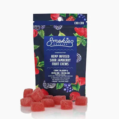 NEW! Smokiez™ Relaxing Sour Jamberry CBD:CBN 2.5:1 Fruit Chews are NOT YOUR AVERAGE GUMMY™ ;) These delicious fruit chews are a tasty and satisfying way for you to medicate. They are also Vegan, Gluten-Free, Dairy-Free, and contain NO High Fructose Corn Syrup. Each of our mouth-watering fruit chews contains 25 mg of CBD and 10 mg of CBN and made with our high clarity hemp extract for great taste. SO... WHAT IS CBN? Cannabinol (CBN) is a mildly psychoactive compound in marijuana and is unique to the plant. According to Steep Hill Labs, Cannabinol is the most sedative known cannabinoid, which makes it an ideal cannabinoid for a solid night of sleep. 10 Pack Contains 10 pieces per package with 250 mg active CBD + 100 mg active CBN per package