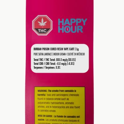 Happy Hour’s Durban Poison 1g Cured Resin Cart delivers the full-spectrum punch of this legendary sativa landrace. Durban Poison is a true sativa, originating from the coastal city of Durban in South Africa. Known for its high resin content, it has become a favourite among concentrate enthusiasts. Cultivated indoors by Headstone Cannabis in Alberta, this single strain cured resin is expertly extracted in Sooke, BC, ensuring a true representation of the cultivar. Meticulously extracted to preserve the strain's rich flavour and aromatic profile, delivering a product that truly captures the essence of Durban Poison. Potent and flavourful, this cart showcases gassy, citrus, and pine notes. Crafted from whole indoor flower, it offers the depth of a dab in a smooth, pocket-sized cartridge. Available for limited-time-only.