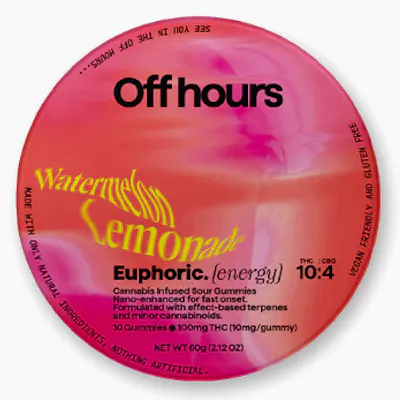 FLAVOR: WATERMELON LEMONADE (SOUR) TERPENES: SPECIAL BLEND FOR ENERGY SIZE: 10CT STRENGTH: 100MG THC (10MG/SERVING) + 20MG CBG (2MG/SERVING) EXPERIENCE EUPHORIA WITH OFF HOURS SOUR WATERMELON LEMONADE GUMMIES, INFUSED WITH AN ENERGIZING BLEND OF THC AND CBG. NANO-ENHANCED CANNABINOIDS FOR FAST ONSET. VEGAN FRIENDLY AND GLUTEN FREE. SUGGESTED USE: START WITH 1/2 OF A GUMMY. WAIT 1 FULL HOUR BEFORE INCREASING DOSE. INGREDIENTS: ORGANIC CANE SUGAR, REVERSE OSMOSIS WATER, ORGANIC TAPIOCA SYRUP, ORGANIC FRUIT JUICE FROM CONCENTRATE, FRUIT PECTIN, ORGANIC FRUIT FLAVORING, NATURAL FOOD COLORING, MCT OIL, CANNABIS EXTRACT, SOY EXTRACT, TERPENES, MALIC ACID