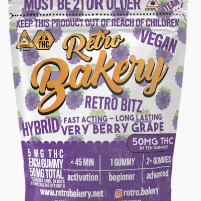Retro Bakery Bitz are premium THC-infused gummies crafted for flavor, consistency, and balanced effects. Each bag contains 10 pieces, with 5 mg of THC per piece, offering a total of 50 mg in a single, convenient package.