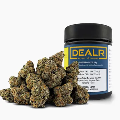 Blizzard of OZ twists together Blizzard Bush and EQ Haze into a spectacle of structure and scent. Its stretched, spiralled buds look sculpted by high winds, stacked with pale-green peaks and amber pistils. Crack the jar to reveal a clean rush of pine and citrus, cooled by a hint of mint leaf, like a proper sativa-dominant cultivar. This DEALR cut embodies sharp, aromatic, and beautifully untamed flower. Grown for those who appreciate expert cultivation. Available for limited-time-only.
