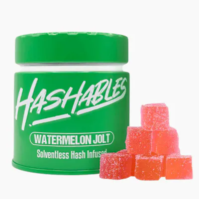**Allergens: Contains Tree Nuts (MCT Oil) // Production Facility Contains: Tree Nuts ,Soy, Milk, and Wheat.** Hashables, a synergy of live hash rosin and scintillating flavor. Zap yourself into a new dimension with these full-spectrum hash-infused edibles! Formulated with solventless hash rosin and natural flavors, the effects of these edibles are potent and full-bodied. So leave it to the solventless extract experts and discover New England's own Hashables. WATERMELON JOLT: Corn Syrup, Sucrose, Water, Gelatin, Dextrose, Sorbitol, Acid Blend, Natural and Artificial flavoring , Solventless Cannabis Concentrate, Natural and Artificial coloring, Potassium Sorbate