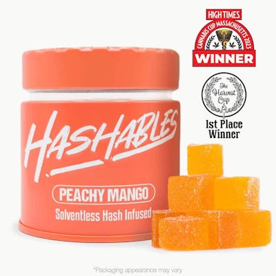 Hashables, a synergy of live hash rosin and scintillating flavor. Zap yourself into a new dimension with these full-spectrum hash-infused edibles! Formulated with solventless hash rosin and natural flavors, the effects of these edibles are potent and full-bodied. So leave it to the solventless extract experts and discover New England's own Hashables. PEACHY MANGO: Corn Syrup, Sucrose, Water, Gelatin, Dextrose, Sorbitol, Citric Acid , Natural and Artificial flavoring, Solventless Cannabis Concentrate, Natural and Artificial coloring, Potassium Sorbate. **Allergens: Contains Tree Nuts (MCT Oil) // Production Facility Contains: Tree Nuts ,Soy, Milk, and Wheat**