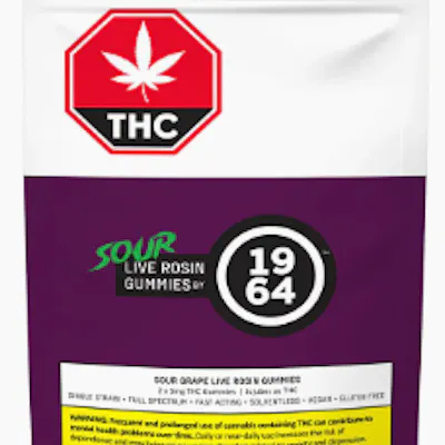 Sour Live Rosin Gummies by 1964 have arrived! The Sour Grape Live Rosin Gummies offer edibles consumers a chance to enjoy the Live Rosin high in a delicious gummy format. Paired with a complimentary Live Rosin, these vegan gluten-free gummies are the perfect option for those looking to get more out of their edibles experience. Ingredients: Sugars (Sugar, Tapioca syrup), Water, Citric Acid, Pectin, Natural Flavour, Sodium Citrate, Natural Colour (Fruit & vegetable juice), Malic acid, Tartaric acid, Live rosin