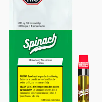 A hurricane level of flavour is coming. The Spinach Strawberry Slurricane 1.2g Vape is inspired by the strain Slurricane, which has a lineage tracing to Purple Punch and Do-si-do. This vape's flavour experience takes you on a whirlwind ride in the sky of fruity tastes, and with 1.2g of the finest cannabis extract, we're bringing the storm with THC levels of up to 1000mg per cart. With our optimized aerosol mass tested vape tech, you'll get bigger hits and bigger flavour. Our rich CO2 extract is cold-filtered at sub-zero temps before it is distilled 4x to ensure consistency and deliver pure consistent quality, time and time again.