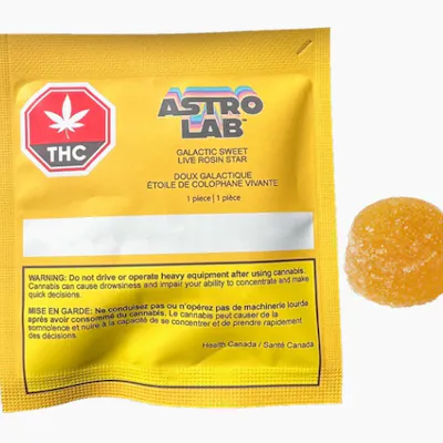 Take a sweet voyage through the cosmos with Astrolab's Galactic Sweet Live Rosin Star. This 10mg single-piece edible combines the purity of solventless live rosin with a delightful burst of sweetness, providing a smooth and potent cannabis experience. Each star is crafted to please the refined palate of the Canadian cannabis connoisseur, delivering a clean, flavourful adventure in every bite. Experience the sweetness of the stars and let your taste buds soar through the galaxy. Ingredients: Sugars (Sugar, tapioca syrup), Water, Citric acid, Pectin, Natural flavour, Natural colour (Vegetable juice), Malic acid, Tartaric acid, Cannabis Live Rosin