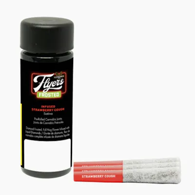 Claybourne Frosted Flyers Infused Strawberry Cough pre-rolls are THCa diamond frosted, terpene enhanced and infused with liquid diamonds. These 3x0.5g pre-rolls are sativa-dominant and boast 40-50% THC. Looking for bold flavour and a potent experience? Look no further than Claybourne Frosted Flyers.