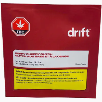 Drift Berry Cherry Glitch is a single, high-potency gummy infused with 10 mg of evenly dosed THC and a blend of sweet berries with tangy cherry undertones. Thanks to our state-of-the-art emulsification process, you can enjoy your experience with very minimal, if any, cannabis taste or smell. Ingredients: OLIGOFRUCTOSE, WATER, GELATIN, NATURAL FLAVOURS, CITRIC ACID, RELEASE AND GLAZING AGENT (VEGETABLE OIL, CARNAUBA WAX), MCT OIL, GLYCERIN