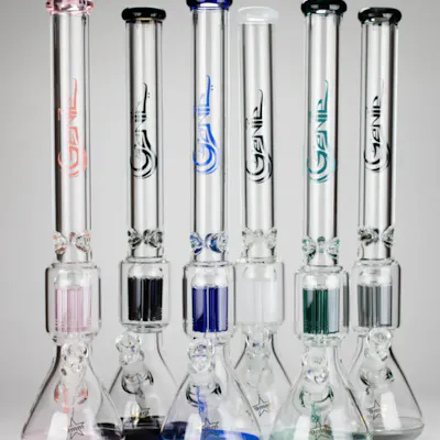 Take your smoking sessions to the next level with the Genie 24-inch 12-Arm Glass Water Bong, engineered for smoothness, durability, and standout design. Crafted from premium 9mm thick borosilicate glass, this towering piece is built to deliver powerful rips with maximum filtration. Height: 24 inches – extra tall for massive hits Thickness: Heavy-duty 9mm borosilicate glass Tube Diameter: 2" mouthpiece / 3" percolator chamber Base Diameter: Wide 5" beaker base for stability Design: Clear body with color-matched percolator, base, and mouthpiece Percolator: 12-arm tree perc for superior diffusion and smoother pulls Bowl: Martini-style glass bowl for 14mm female joint Ice Catcher: 3-pinched design to cool every hit Downstem: 5.5" diffused downstem for added filtration Set Includes: 3-piece setup (beaker base, downstem, bowl) With its 12-arm percolator and 9mm thick glass, this Genie water bong offers unmatched durability and performance. Perfect for enthusiasts seeking a premium centerpiece that delivers smooth, cool, and flavorful hits every time.