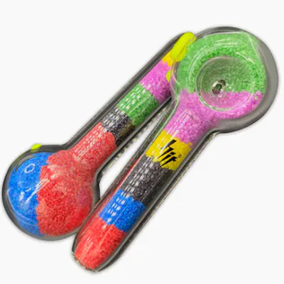 The all-clear hand pipe is filled with colourful sand, giving it more weight in your hands. The carb hole is located directly opposite of the mouth opening. The bowl is shallower than most, but also wider to counter-balance it. Roll stoppers on the side prevent any unwanted mishaps. Borosilicate glass Roll stopper Carb hole