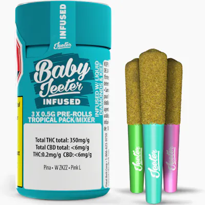 Indulge in an endless summer with this Canada-exclusive trio of Baby Jeeter flavours, crafted for those who crave bold taste and premium quality in every pull. This multipack brings together three refreshing favourites—Pink Lemon, Pina, and Watermelon ZKZ—each offering its own juicy burst of tropical, citrusy, or candy-sweet goodness. Every Baby Jeeter pre-roll is meticulously made with high-quality flower, infused with liquid diamonds, and finished with a smooth layer of premium kief for that signature punch of potency and flavour. Highlights: Canada-exclusive trio featuring Pink Lemon, Pina, and Watermelon ZKZ Infused with liquid diamonds and coated in premium kief Bold, juicy flavours in every pre-roll Crafted with high-quality flower for consistent potency and smooth burns This vibrant trio is perfect for discovering new favourites, sharing with friends, or simply chasing endless summer vibes—a flavour-packed, elevated experience in every spark.