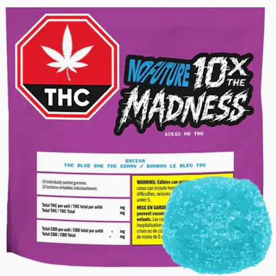 This isn’t just a hit—it’s a detonation. 10X The Madness takes 10 individual packs of No Future’s fan-fave The Blue One gummies and turns them into the ultimate 100 mg THC survival kit. Each multipack contains 10 soft chews, individually wrapped for maximum freshness, flavor, and convenience. Big potency. Bold flavor. All in one box. Ingredients: Sugars (glucose syrup, sugar), Water, Gelatin, Citric acid, Natural and artificial flavour, Modified coconut oil medium chain triglycerides, Malic acid, Fumaric acid, Brilliant blue FCF (colour), Palm oil, Hydrogenated palm oil, Cannabis extract.
