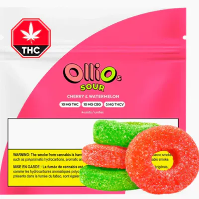 Sour Cherry & Watermelon flavor takes center stage in Olli O's, boasting a unique, fun shape that promises a multisensory experience, providing candy enthusiasts with an exciting burst of flavor and texture. Elevate your taste buds with these dual-flavored, sour tangy delights, designed to captivate and satisfy your craving for a playful indulgence. 10mg THC/10mg CBG/5mg THCV Ingredients: Sugars (sugar, glucose syrup), Water, Modified Corn Starch, Glycerin, Natural flavours, Pectin, Citric acid, Soy lecithin (Soy), Medium chain triglycerides (palm), Lactic acid, Malic acid, Sodium citrate, Allura Red (colour), Brilliant Blue FCF (colour), FD&C Yellow 6 (colour), Hydrogenated oil vegetable fat, Cannabis extract