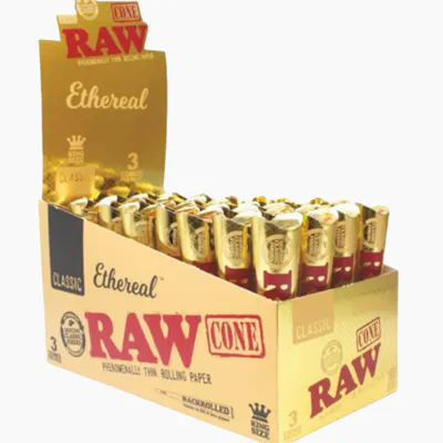 Experience the ultimate in smooth, pure smoking with RAW Ethereal King Size Cones. Crafted from ultra-thin, translucent RAW Ethereal paper, these pre-rolled cones offer an exceptionally clean and weightless smoking experience. Perfect for those who want to fully appreciate their material, the cones burn evenly and effortlessly, minimizing paper taste while maximizing flavor. Each cone is precision-crafted for easy filling and consistent quality, making every session seamless and enjoyable. With 3 cones per pack and 32 packs per display, RAW Ethereal King Size Cones are ideal for enthusiasts who value purity, elegance, and a premium smoke. Highlights: Ultra-thin, translucent RAW Ethereal paper: Pure, clean, and weightless smoke King Size pre-rolled cones: Longer, fuller sessions Smooth, even burn: Minimal paper taste for enhanced flavor Precision-crafted: Easy to fill and consistent quality Packaging: 3 cones per pack, 32 packs per display Delicate construction: Handle with care for best results