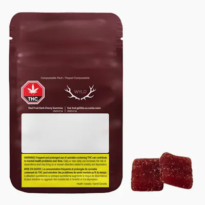 Relax and unwind with Wyld Dark Cherry Indica Enhanced Gummies, a CBN-dominant 5:1 ratio edible crafted to support rest, recovery, and relaxation. Each gummy delivers 5mg CBN and 1mg THC, for a total of 50mg CBN and 10mg THC per 10-pack—the ideal microdose for a mellow, sleep-friendly experience. Made sustainably with real fruit, botanical terpenes, and natural flavours, these rich dark cherry gummies offer a deliciously tart flavour profile while aligning with your wellness goals. Wyld gummies are vegan, gluten-free, and crafted with compostable packaging—perfect for eco-conscious consumers. ✅ 5mg CBN + 1mg THC per gummy ✅ Indica-enhanced with calming terpenes ✅ Sleep support and evening relaxation ✅ Vegan | Gluten-Free | Real Fruit Flavour ✅ Sustainable & Compostable Packaging Ingredients: Sugar (Sugar, Tapioca Syrup, Cherry Juice Concentrate), Water, Gelatin, Coconut Oil, Natural Flavoring,Malic Acid, Citric Acid, Pectin (Pectin, Sodium Citrate), Cannabis Extract, Sunflower Lecithin, Terpenes (Limonene, Valencene, Beta Caryophyllene, Alpha Pinene, Beta Pinene)