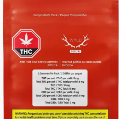Wyld Sour Cherry Indica Enhanced THC Soft Chews are sustainably made using real fruit, botanical terpenes and natural flavours. Each Soft Chew contains 5mg THC, for a total of 10mg THC per pack. All Wyld Soft Chews are packaged in an all-new compostable pouch, and our recipes are formulated by food scientists to provide consistent experiences that taste amazing. Wyld Soft Chews use sunflower lecithin to improve bioavailability and onset time and are made to be thermostable up to 60 degree celcius, with a firm texture that doesn't stick to your teeth. Each Wyld Sour Cherry Indica Enhanced Soft Chew contains 5mg of THC combined with the terpenes myrcene, linalool, beta-caryophyllene, and terpineol for a relaxed and euphoric experience. Wyld uses carbon neutral manufacturing to support a healthy planet. Two Soft Chews per pack. Ingredients: Sugars [Sugar, Tapioca Syrup, Cherry Juice Concentrate], Water, Gelatin, Malic Acid, Coconut Oil, Natural Flavoring, Citric Acid, Pectin (Pectin, Sodium Citrate), Cannabis Extract, Sunflower Lecithin, Terpenes (Linalool, Myrcene, Beta Caryophyllene, Terpineol).
