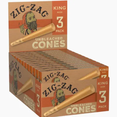 These pre-rolled cones make it easy, just fill and pack. These cones feature a branded tip and distinctive slide box that is crush proof and pocket friendly. Zig-Zag® unbleached paper cones are crafted from the finest blend of natural fibers to deliver a slow, even burn with zero hassle – just fill, pack and burn. Features: Unbleached King Size 3 cones per pack 24 3-packs per carton