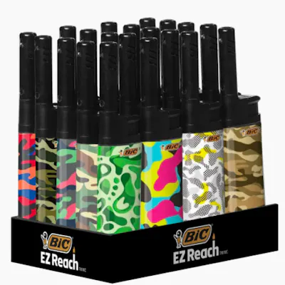 Whether you’re lighting a bowl, candles for a special occasion, grilling at home, BIC® EZ Reach™ is there to light the way! The EZ Reach™ is an essential tool for safe and convenient indoor and outdoor lighting needs. Bic's high-performing, long-lasting lighters feature a durable 1.45-inch wand to help keep hands away from fire, have a child-resistant mechanism, and are 100% quality inspected. This display contains 20 BIC® EZ Reach™ Lighters in assorted Camo series. Bic EZ Reach Features: Assorted Camo Series Pocket Size Convenient Perfect for Lighting Bowls Helps Keep Fingers Away from Flame Child Safety Guard