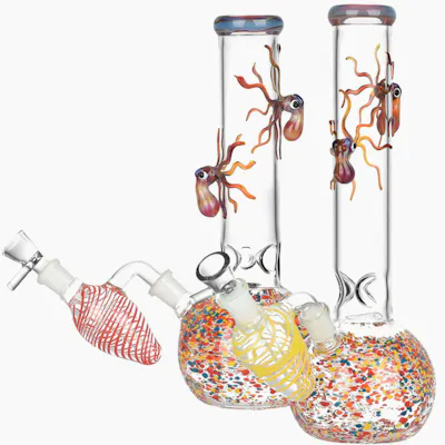 Dive into artistic expression and smooth sessions with the Octopus Frit Bubble Base Water Pipe – a functional showpiece that blends playful design with premium performance. Standing 10 inches tall, this uniquely crafted water pipe features a bubble base body and is adorned with dual octopus decorations on the neck and a stunning rainbow frit base, making every piece a vibrant, one-of-a-kind masterpiece. Equipped with smoke-cooling features and crafted for stability, this piece is as reliable as it is eye-catching – perfect for collectors and daily users alike. Key Features: 10” Height: A compact yet statement-making size for home or travel use Bubble Base Body: Enhances smoke diffusion for smoother draws 3-Pinch Ice Catcher: Add ice for cool, crisp hits every time Fixed Downstem with Ash Catcher: Clean, stable, and mess-reducing 14mm Male Herb Slide with Handle: Easy to use, fits standard accessories Hand-Blown Rainbow Frit Base with Octopus Accents: Every pipe is uniquely coloured and full of personality Colours Vary: Each piece offers a distinct visual style Why You'll Love It: This water pipe isn’t just about function – it’s about fun, flair, and fluid design. The octopus neck details and vibrant frit finish make it a standout on any shelf or session. Whether you're expanding your glass collection or looking for a reliable daily driver, this piece brings both style and smoothness in every hit.