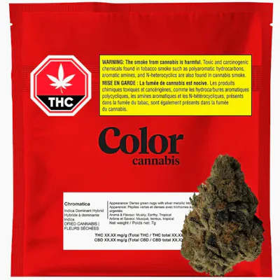 Color Cannabis Chromatica is an indica‑dominant hybrid strain bred from the renowned genetics of God Bud × OG Kush. This terpene-forward cultivar is recognized for its dense green buds, highlighted by a silver, metallic trichome sheen that signals careful cultivation and strong resin production. Chromatica delivers a fresh, fragrant aroma layered with earthy sweetness and subtle notes of fruit and musk. The flavour follows through on the nose, offering a smooth and balanced smoke with classic kush undertones and a refined, slightly sweet finish. Its indica-dominant lineage makes it well suited for consumers seeking a calming, body-forward experience while maintaining mental clarity. Grown using elevated indoor cultivation practices—including precise temperature and humidity control—Chromatica is hang-dried to preserve terpene integrity and cannabinoid content. Each batch is nitrogen packaged to maintain freshness, protect aroma, and ensure a consistent experience from first open to final grind. For consumers shopping for premium indica-dominant hybrid flower in Canada, Chromatica stands out as a carefully cultivated option that combines respected legacy genetics with modern growing standards. Product Highlights Brand: Color Cannabis Strain Type: Indica-dominant hybrid Genetics: God Bud × OG Kush Appearance: Dense green buds with silver trichome sheen Aroma: Earthy sweet with fruit and musk notes Flavour Profile: Smooth, earthy, subtly sweet kush finish Cultivation: Controlled indoor environment (temperature & humidity) Drying Method: Hang-dried for terpene preservation Packaging: Nitrogen sealed for maximum freshness