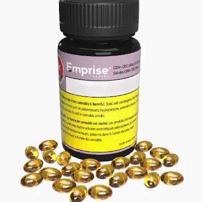 Emprise CBN 10 mg + CBD 50 mg Softgels offer a balanced CBN and CBD experience, perfect for those seeking a calming, restorative effect. Each softgel delivers 10 mg CBN and 50 mg CBD, formulated with high-quality isolates and coconut-derived MCT carrier oil for optimal absorption. Each bottle contains 30 softgels, providing a total of 300 mg CBN and 1,500 mg CBD. Designed for discreet, consistent dosing, these softgels keep cannabis oil fresh and sealed from oxidative degradation, offering excellent value compared to edibles. Key Features: 10 mg CBN + 50 mg CBD per softgel 30 softgels per bottle (Total 300 mg CBN & 1,500 mg CBD) Formulated with CBN & CBD isolates Coconut-derived MCT carrier oil for enhanced absorption Discreet, convenient, and oxidation-resistant dosing Ingredients: Cannabis, Cannabis Extract, MCT Oil