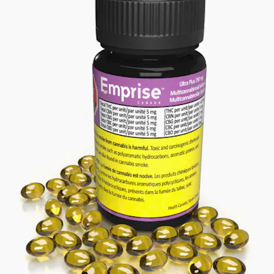Emprise Ultra Plus Multicannabinoid Softgels deliver a balanced, full-spectrum-inspired formula featuring five key cannabinoids in equal measure — THC, CBN, CBG, CBC, and CBD. Each softgel contains 10 mg of each cannabinoid (total 50 mg per capsule), crafted from premium distillates and isolates for precise, consistent dosing. Formulated in hemp seed carrier oil to support the entourage effect, Ultra Plus stays true to the plant’s natural balance — because if it grows together, it goes together. With 30 softgels per bottle, you get a total of 300 mg of each cannabinoid (1,500 mg combined) in a discreet, convenient format that maintains freshness and potency. Key Features: 10 mg THC + 10 mg CBN + 10 mg CBG + 10 mg CBC + 10 mg CBD per softgel Balanced multicannabinoid formulation Hemp seed carrier oil for entourage effect support 30 softgels per bottle (300 mg each cannabinoid; 1,500 mg total) Consistent, precision dosing in a discreet format Sealed to protect from oxidative degradation Ingredients: Hemp Seed Oil, Bovine Gelatin, Cannabis Extracts, Glycerin, MCT Oil, Water.