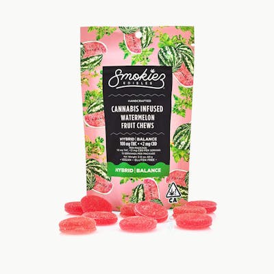 Smokiez Watermelon Hybrid Fruit Chews are NOT YOUR AVERAGE FRUIT CHEWS™ ;) These fruit chews taste like a ripe and juicy watermelon, with a pleasant balance of sweetness and fruity notes. These delicious fruit chews are a tasty and discreet way for you to medicate! They are also Vegan, Gluten Free, Dairy-Free, and contain NO High Fructose Corn Syrup. Each of our mouth watering fruit chews contain 10 mg of THC, and made with our high clarity cannabis distillate for great taste. There are 10 pieces per package with 100 mg active THC per package.