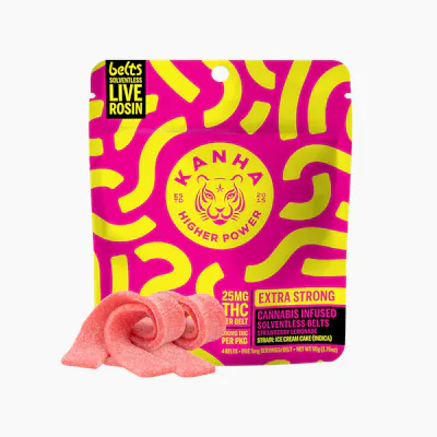 K*25mg THC per belt/100mg THC per package* Relax and unwind with our Strawberry Lemonade Belts, a bold Indica blend for the kick back connoisseurs. Enhanced with Ice Cream Cake solventless live rosin for deep relaxation and euphoria. - Solventless Rosin - Strain-Specific - Fast-Acting NANO - Hits Like Flower