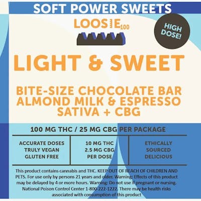 Boost your day with Soft Power Sweets – Light and Sweet Loosie Chocolate Espresso Bar, a premium edible combining rich chocolate and bold espresso flavor. Infused with a 4:1 THC:CBG ratio and 100mg total cannabinoids, this bite-sized bar delivers an energizing, focused, and uplifting experience. Perfect for daytime use, it balances mental clarity with a gentle body buzz for smooth, functional enjoyment. Product Highlights: Cannabinoid Ratio: 4:1 THC:CBG Total Cannabinoids: 100mg per bar Format: Bite-sized solid chocolate bar Flavor Profile: Rich chocolate with espresso notes Effects: Uplifting, energizing, and focused Elevate your daytime routine with Soft Power Sweets – Light and Sweet Loosie Chocolate Espresso Bar, available now at Cannabis Realm of NY. Download COA Suggestions More from Soft Power Sweets Customer Reviews There are no reviews for this product yet. Be the first to add one!