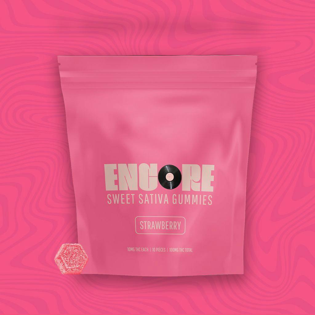 The chewy chart-toppers. Sugary sativas, sweet indicas, sour CBD ratios, and full-spectrum RSO infusions headline the Encore lineup. Juicy and delicious, classic fruit flavors and the perfect pectin-based consistency are always center-stage. - Cue the sunshine with Sweet Strawberry Sativa, a burst of strawberry jam flavor and sativa energy for bright moods and bold moves.