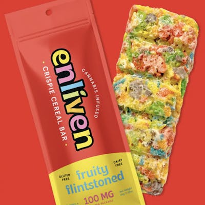 Enliven is proud to now offer Fruity Flintstoned Cereal Bars. These cereal bars are a delicious twist on the classic Fruity P. Cereal Bars, bursting with bright colors and flavors. They are gluten free and dairy free. Each bar contains 100 mg THC, sourced from the highest grade hybrid distillate, extracted with CO2 for a long lasting, full entourage effect. The bars are sectioned into five pieces for easy dosing.