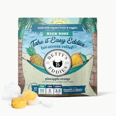 Enjoy a piece of peace with our Take it Easy Eddies. These pineapple orange chews are infused with a natural blend of THC, CBDV, and CBG, plus passionflower, chamomile, and L-theanine, which may help you feel mindful and meditative. You're on island time now!
