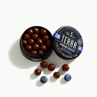 Blueberry Terra Bites are the latest innovation in our line of best-selling Terra Bites. Using a traditional 24-hour panning process, dried US-grown blueberries are dusted with cocoa powder and finished with a generous coating of delicious milk chocolate. Each 5MG bite is polished to sweet, tart, irresistible, perfection. Ingredients: Milk Chocolate (Sugar, Cocoa Butter, Milk, Unsweetened Chocolate, Lecithin (Sunflower and/or Soya), Vanilla), Cultivated Blueberry (Sugar, Blueberry, Sunflower Oil), Confectioner's Glaze, Cannabis Extract, Cocoa Powder, Natural Flavor, Citric Acid. Allergy Warning: Contains Milk. May Contain Traces of Nuts.