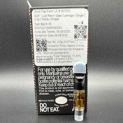 Live Resin Cartridge .5g - Malibu Mirage, 71.02% THC - Good Day